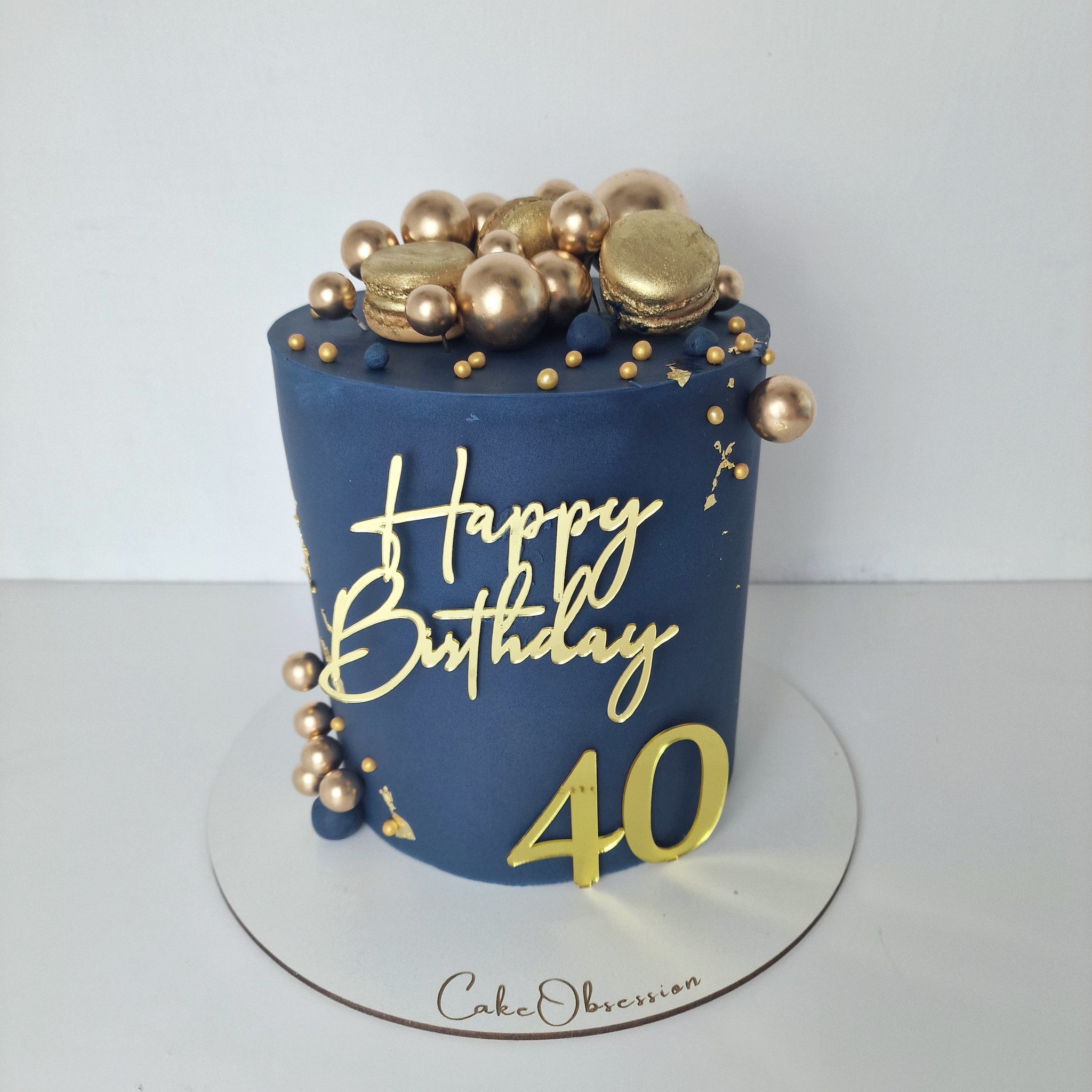 Indulge in our exquisite navy blue cake, beautifully adorned with golden macaroons and decorative golden balls.