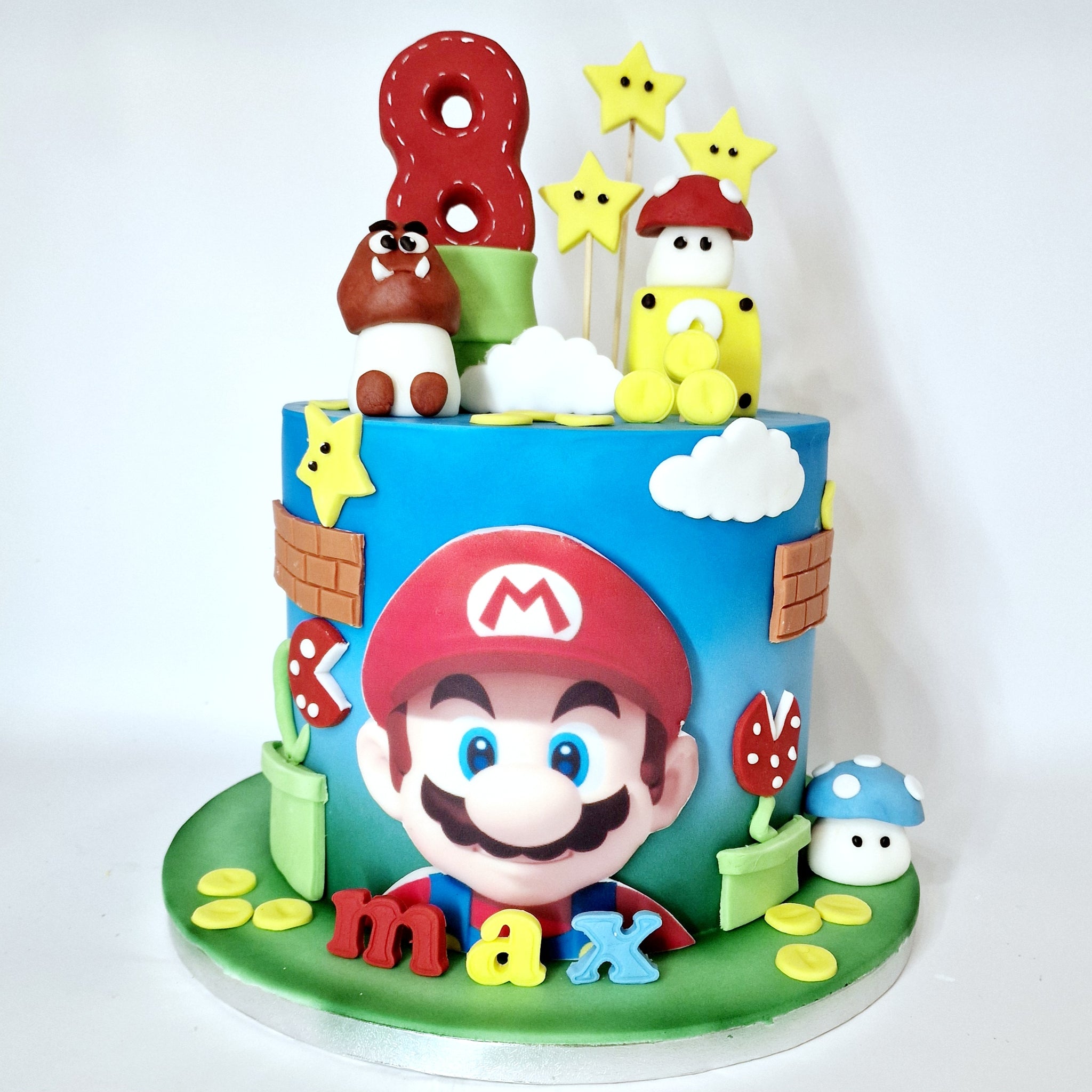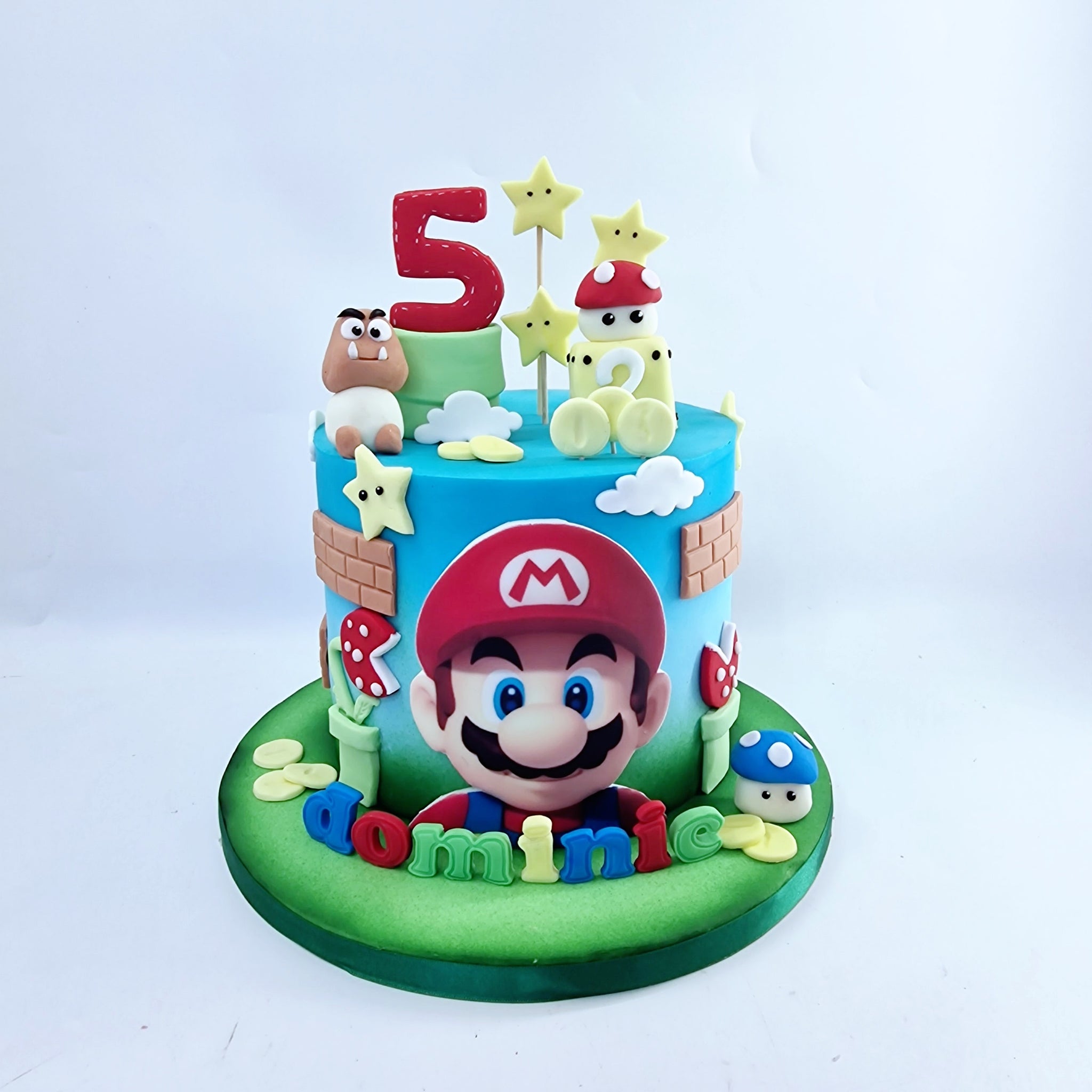 Check out this amazing Super Mario cake! With intricate fondant work, this cake features all the classic elements of the iconic video game, including green pipes, power-up mushrooms and coins. But the real standout is the Super Mario face on the front! With his mustache, shiny hat and big round eyes, it's impossible not to love this cute and whimsical character. Whether you're a long-time fan or a newcomer, this cake is sure to bring joy and nostalgia to any celebration!