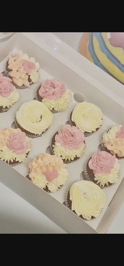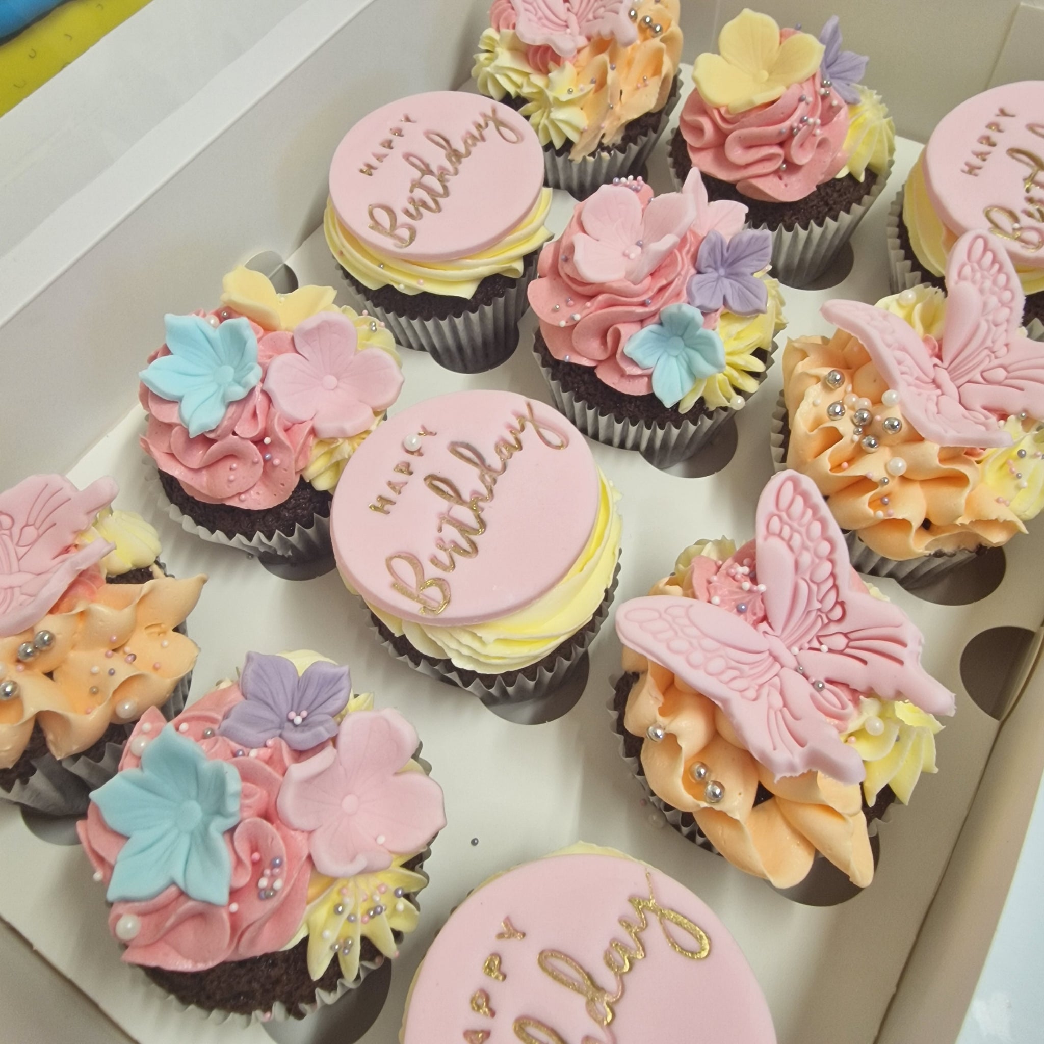 Each cupcake is lovingly decorated with handcrafted sugarpaste flowers, adding a burst of color and beauty.